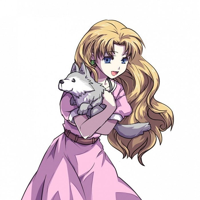 簡素なワンピース、ロングブーツ、小型の竪琴を装備していて、生後三ヶ月の仔狼シッポを連れている。